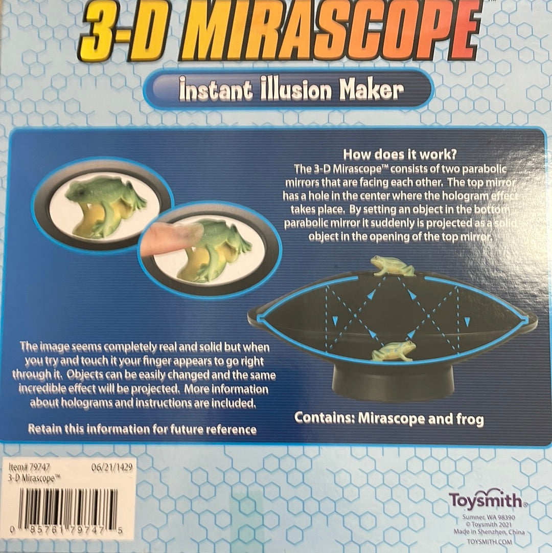 - đź’ˇ3D ILLUSION MAKER - The mirascope takes small objects and uses an optical illusion to create a 3D holographic projection.
