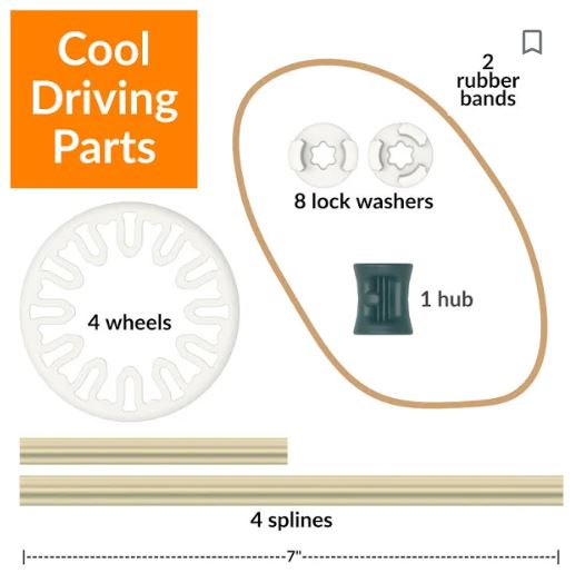 - Set includes 19 pieces --- all the parts you need for driving - wheels axles hubs rubber-band drivetrains.