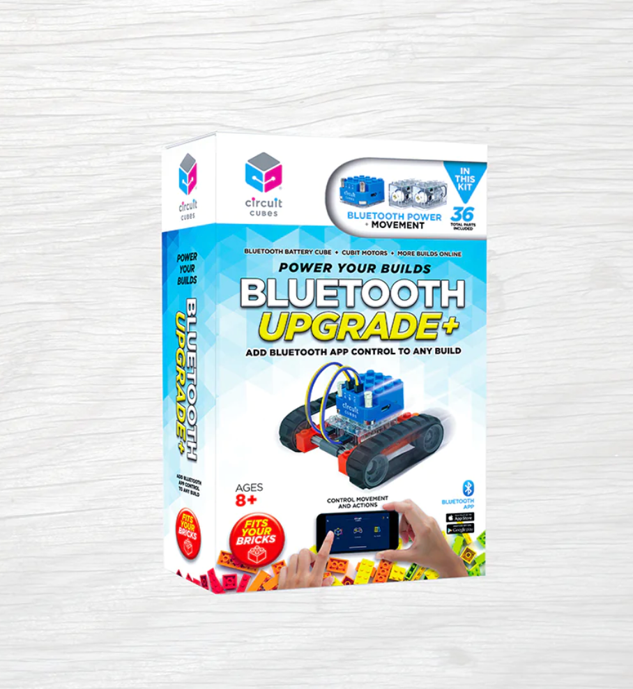 Add Bluetooth app control to any build with the Circuit Cubes Bluetooth Upgrade Kit! This kit comes with a Bluetooth Battery Cube, two Cubit Motors, and a total of 36 parts (bricks, wheels, gears, axels, connection wires). Combine this launch kit contents with your imagination and existing LEGO parts to create your own vehicle, mech monster, and other animated creations!
