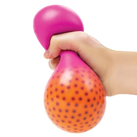 Brightly colored skins filled with a thinner, more fluid gel and black water beads. Watch this ball morph from one color to another with every squeeze! The water beads provide a pleasing sensation as they slip and slide through your hands. Assorted colors.