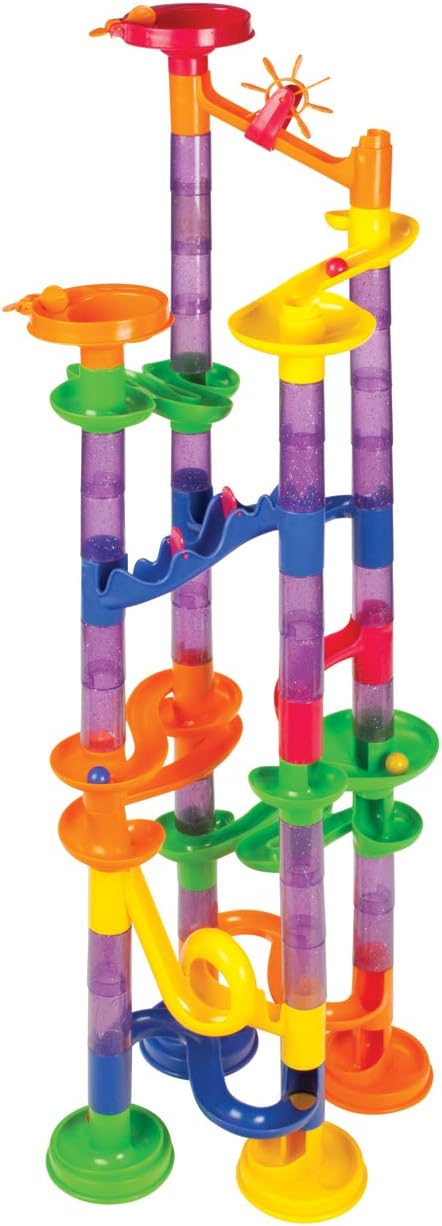 - The Marble Run contains curved tracks, ramps and chutes that fit together in countless variations. Once the course is assembled, drop the marbles in and watch them go.