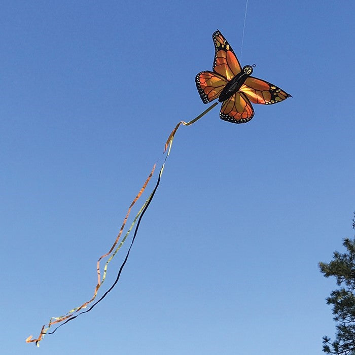 The Monarch Butterfly Kite features a stunning printed design that is vivid when the kite is flying in the sky or when light shines through it.