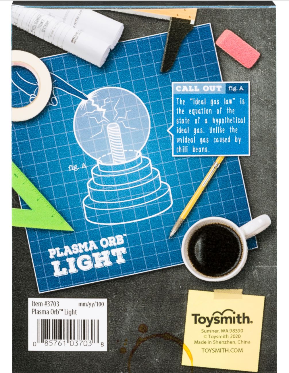 This portable desktop plasma orb from Project Blueprint is a top seller. A fun light-up science-inspired item, the Plasma Orb Light measures 6 inches in diameter. Orb is made of high-quality, thick clear glass and balanced on a tiered base made of 4 layers. Base is a bright translucent blue. Touch-activated plasma streams can be controlled as fingers move across the orb. Features an ON and OFF switch and requires 4 AAA batteries.