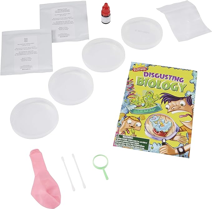 - Includes 4 petri dishes, magnifier, 2 cotton swabs, agar, baking yeast, red food coloring, rubber balloon, plastic bag and guide