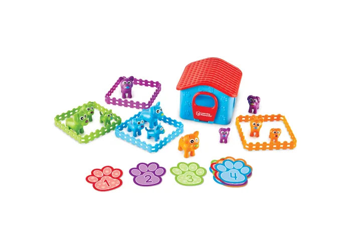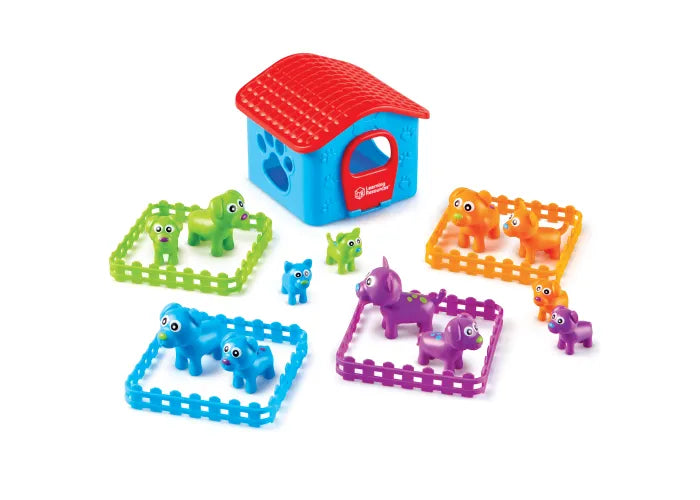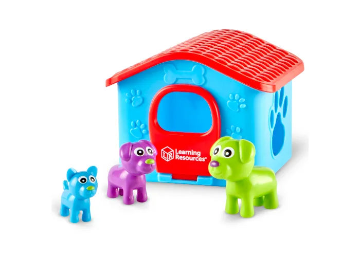 Build early sorting and critical thinking skills as your sort and match these puppy pals! Explore 6 ways to sort: group puppies by size, color, spots, and more. Pieces store inside dog house for easy clean-up.
