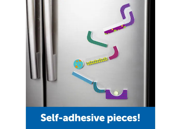 Using the set's cling-back pieces, build tracks on walls and windows to solve STEM challenges! Self-adhesive cling-back pieces require no permanent adhesive!