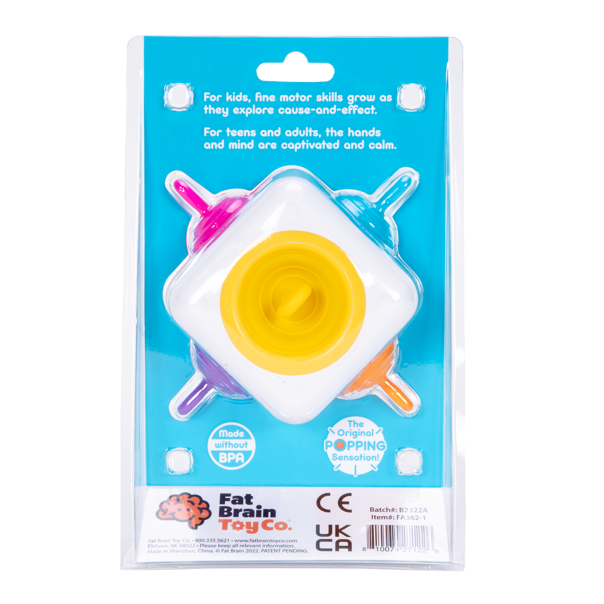 Built into each side of this sturdy, rounded cube is a soft silicone bubble with a tab to grab and pull. Fingers can't help but push them, pull them, and pop them again and again.